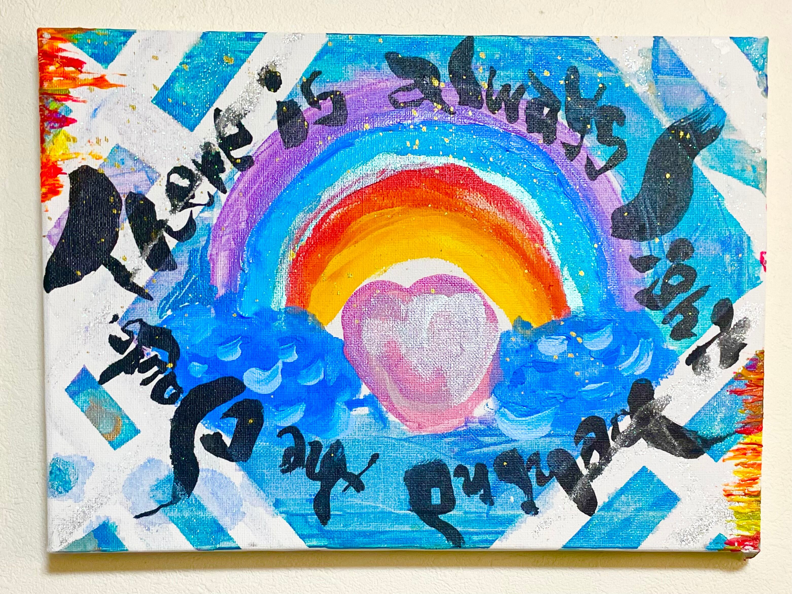 キャンパスにアクリル絵の具で描いてます。ロハロハkids&ママ2人と仲間達みんなで筆を入れて